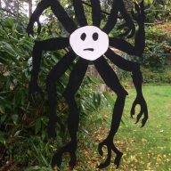 Making this all come together was something of a nightmare, and involved me out in the cold last night having to rig up various bits of fishing wire, nails, and screws to keep things in place. I have no idea how I’m going to store this thing — just how much of it I have to take apart before I can fit it reasonably back into the workshop.  There are six different parts — eight if you count the 2 x 4s on the garage door that it’s hanging from — and I dread the idea of having to detach and reattach at least some of them.  Now that it’s all together, I really want to get some more of that ply-board, and make that tentacle on the right much bigger.  Maybe next year.