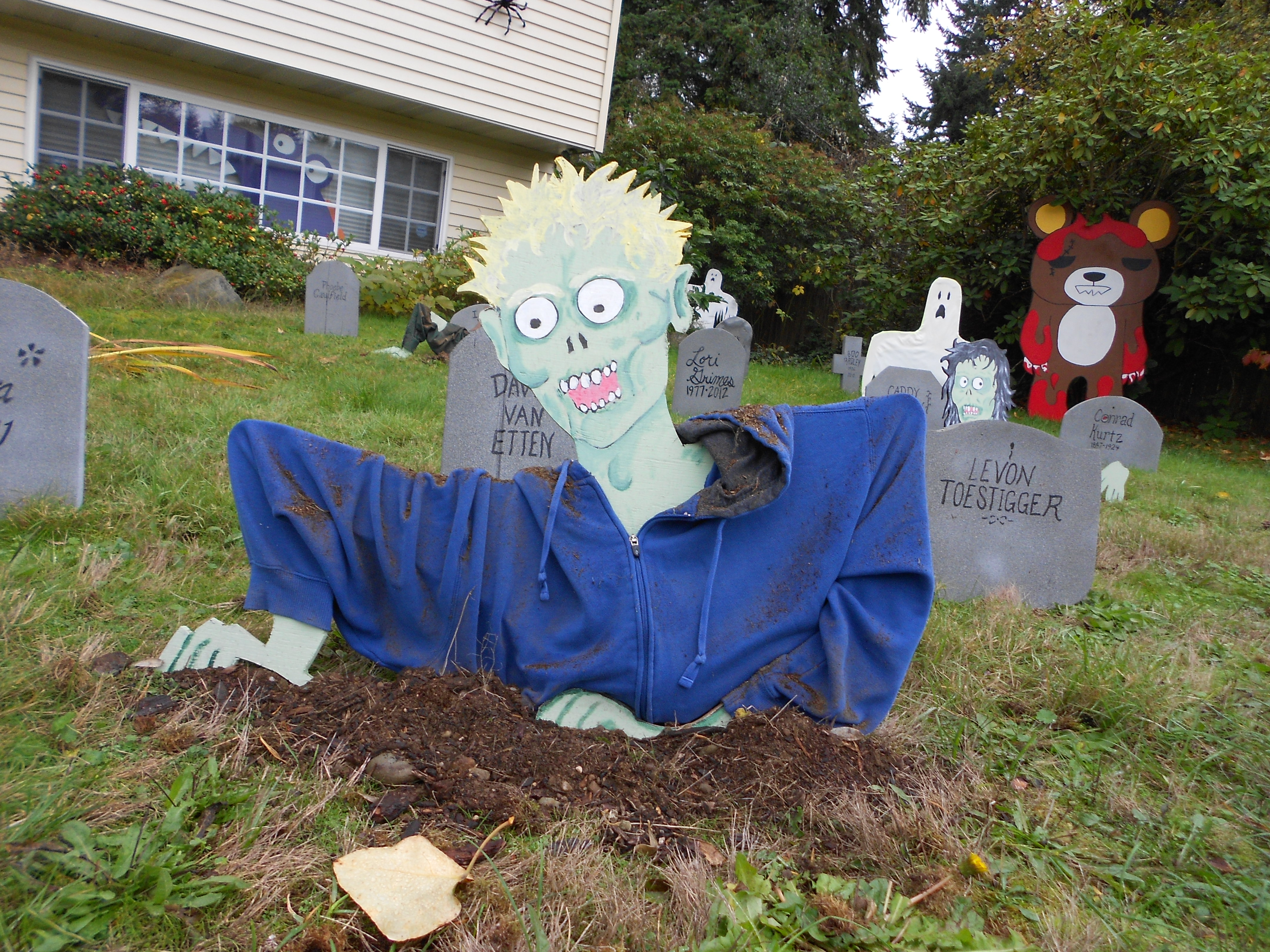 The lettering is all done freehand, in a variety of styles, partially depending on how the paint, paintbrushes, and the surface is behaving, but mostly just based on me winging it and hoping I don’t screw anything up too much. The tombstones, per tradition, all involve the names of various fictional characters from books, comic books, and song. The only one not visible in the picture (blocked by a zombie) is Caddy Compson.